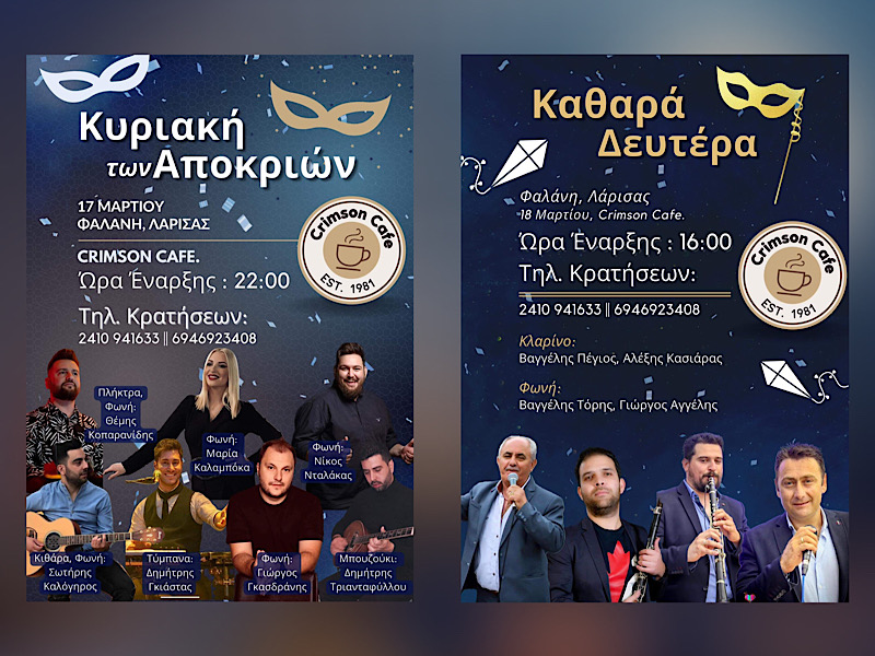 Το κέφι και ο χορός θα μονοπωλήσουν φέτος τις απόκριες για όσους επιλέξουν το Crimson Cafe για τη διασκέδασή τους, την Κυριακή της Αποκριάς, με Live μουσική στην φωνή οι Μαρία Καλαμπόκα, Γιώργος Γκασδράνης, Νίκος Νταλάκας, μπουζούκι Δημήτρης Τριανταφύλλου, φωνή-κιθάρα Σωτήρης Καλόγηρος, πλήκτρα – φωνή Θεμης Κοπαρανίδης, τύμπανα Δημήτρης Γκιάστας, επίσης το κατάστημα θα ψήσει διάφορα κρεατικά.