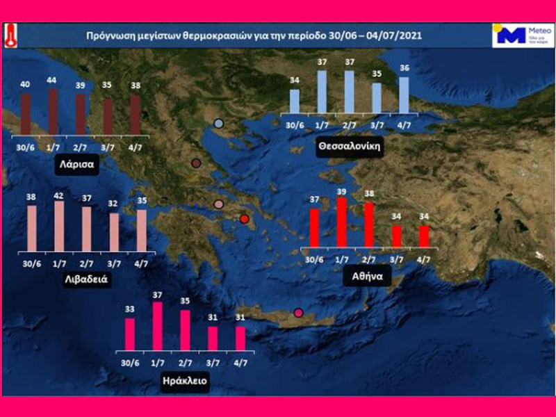Στον παρακάτω Χάρτη εμφανίζεται η πορεία της μέγιστης θερμοκρασίας από την Τετάρτη 30/06 έως και την Κυριακή 04/07, σε πέντε επιλεγμένες πόλεις της Ελλάδος, με τις μεγαλύτερες μέγιστες θερμοκρασίες τις επόμενες ημέρες να καταγράφονται στη Θεσσαλία και στη Βοιωτία.