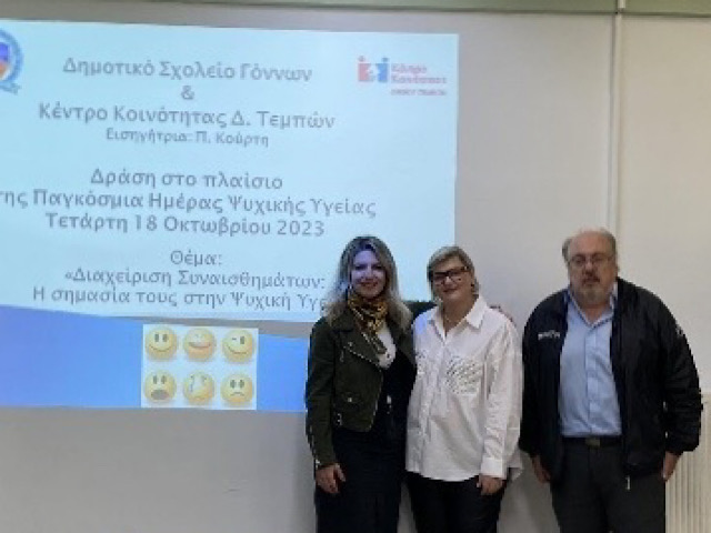 Με αφορμή την Παγκόσμια Ημέρα Ψυχικής Υγείας στις 10 Οκτωβρίου και στα πλαίσια της συνεργασίας μας με το Δημοτικό Γόννων, την Τετάρτη 18 Οκτωβρίου 2023 πραγματοποιήθηκε εργαστήριο από τη Κοινωνική Λειτουργό του Κέντρου Κοινότητας Δήμου Τεμπών κα Κούρτη Γιώτα με τους μαθητές της ΣΤ Δημοτικού, με θέμα: «Διαχείριση Συναισθημάτων: