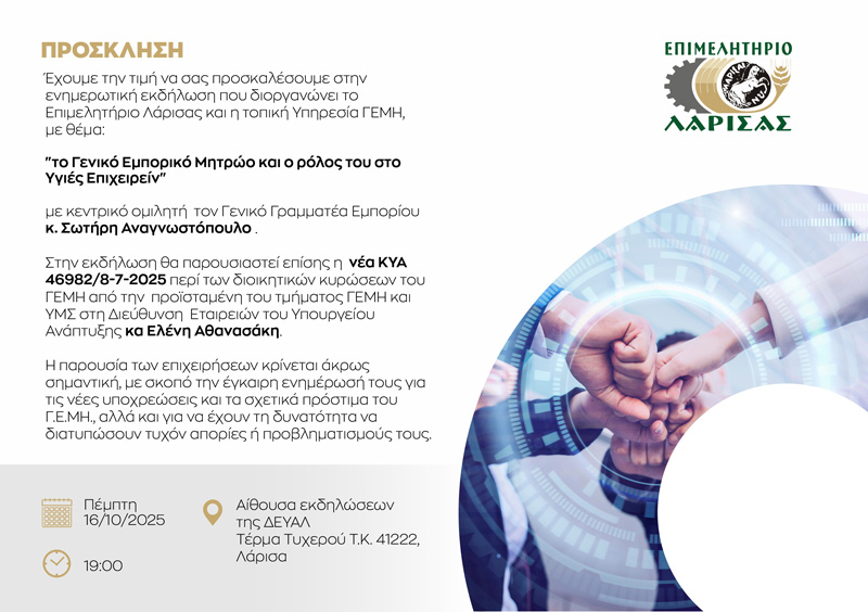 Το Επιμελητήριο Λάρισας, την Πέμπτη 16 Οκτωβρίου 2025 και ώρα 19:00 στην αίθουσα εκδηλώσεων της ΔΕΥΑΛ, διοργανώνει εσπερίδα, με θέμα: