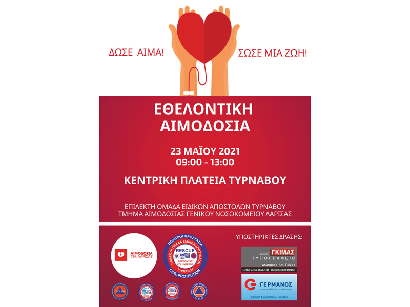 Εθελοντική αιμοδοσία της ΕΠΟΜΕΑ Τυρνάβου σε συνεργασία με την Επίλεκτη Ομάδα Ειδικών Αποστολών Λάρισας και το τμήμα αιμοδοσίας του Γενικού νοσοκομείου Λάρισας, θα πραγματοποιηθεί την Κυριακή 23/05/2021στην κεντρική πλατεία του Τυρνάβου και ώρες από 09:00-13:00.