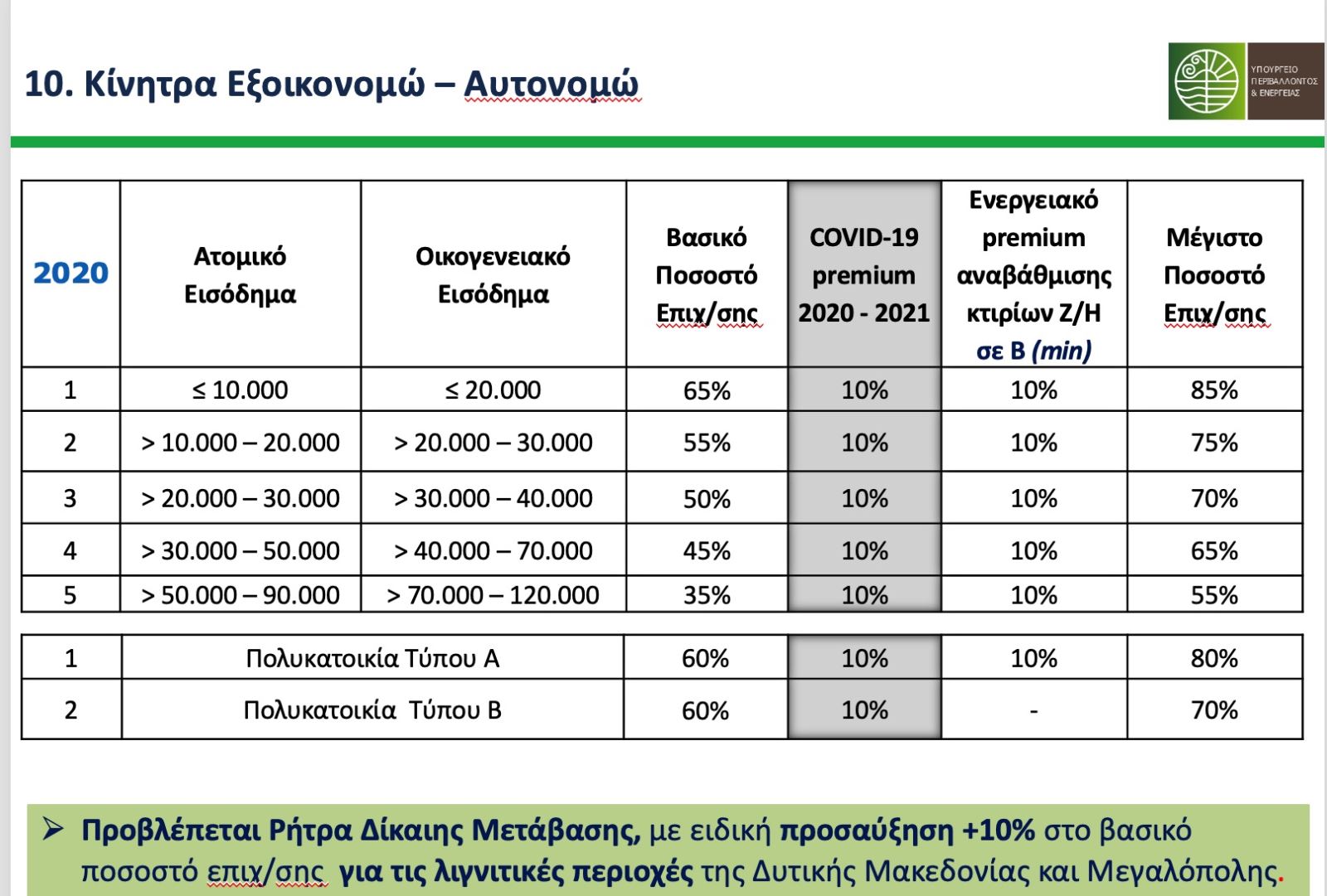 Δικαιούχοι είναι φυσικά πρόσωπα με εμπράγματο δικαίωμα (πλήρους κυριότητας/επικαρπίας/ψιλής κυριότητας) σε επιλέξιμη κατοικία και εφόσον πληρούν τα εισοδηματικά κριτήρια ενίσχυσης. Για νοικοκυριά χαμηλού εισοδήματος (ατομικό εισόδημα ως 10.000 ευρώ ή οικογενειακό ως 20.000 ευρώ) το βασικό ποσοστό επιχορήγησης είναι 65%, στο οποίο προστίθεται 10% ως «ρήτρα κορονοϊού» για τη διετία 2020-2021 και επιπλέον 10% για κτίρια χαμηλής ενεργειακής κατάταξης (Ζ/Η). Για τις λιγνιτικές περιοχές της Δυτικής Μακεδονίας και της Μεγαλόπολης προστίθεται επιπλέον 10 % οπότε στις περιοχές αυτές η επιχορήγηση φθάνει μέχρι 95 %.