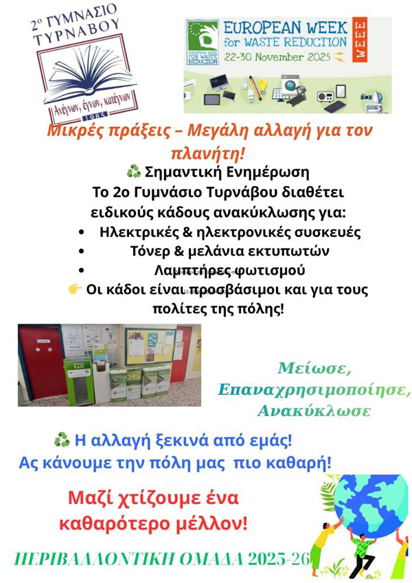 Το 2ο Γυμνάσιο Τυρνάβου συμμετείχε για τέταρτη συνεχόμενη χρονιά στην Ευρωπαϊκή Εβδομάδα Μείωσης Αποβλήτων 2025, μια μεγάλη πανευρωπαϊκή εκστρατεία ευαισθητοποίησης που προωθεί την αειφόρο διαχείριση των αποβλήτων, βασισμένη στις αρχές Μείωση – Επαναχρησιμοποίηση – Ανακύκλωση.