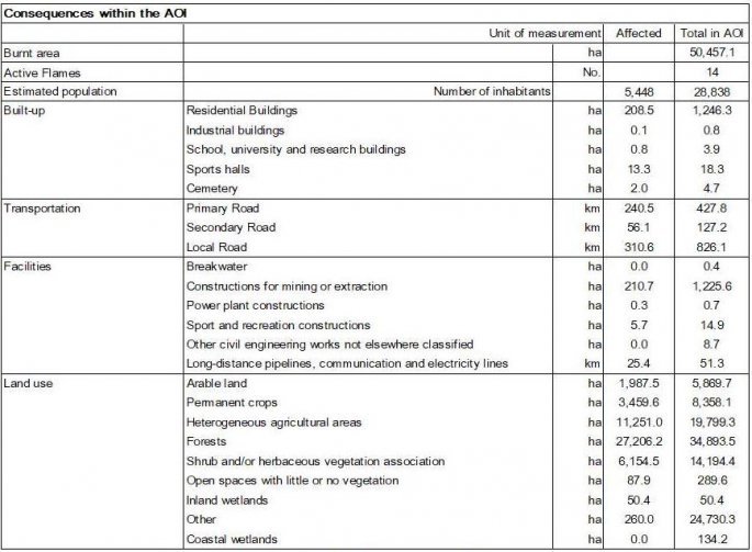 Σύμφωνα με τα στοιχεία που παραθέτει η υπηρεσία Copernicus, συνολικά η περιοχή που έχει καεί από τις φωτιές αντιστοιχεί σε 50.456,1 εκτάρια (ένα εκτάριο ισούται με 10 τετραγωνικά μέτρα επομένως η καμμένη έκταση αντιστοιχεί σε 504.561 τ.μ) ενώ αυτή τη στιγμή τα ενεργά πύρινα μέτωπα είναι 14. Ο πληθυσμός στην περιοχή ενδιαφέροντος αντιστοιχεί σε 28.838 κατοίκους, από τους οποίους περίπου 5,448 έχουν επηρεαστεί.