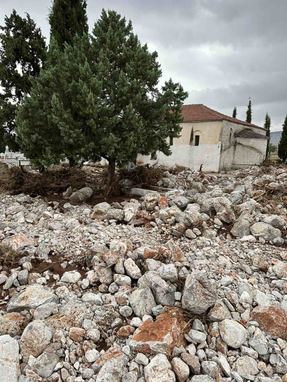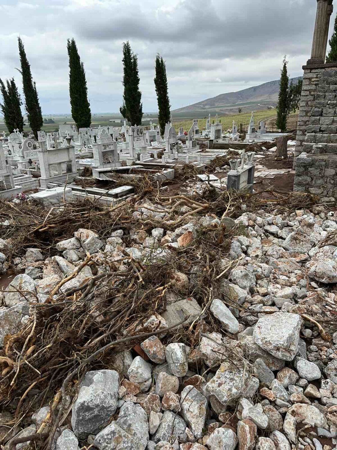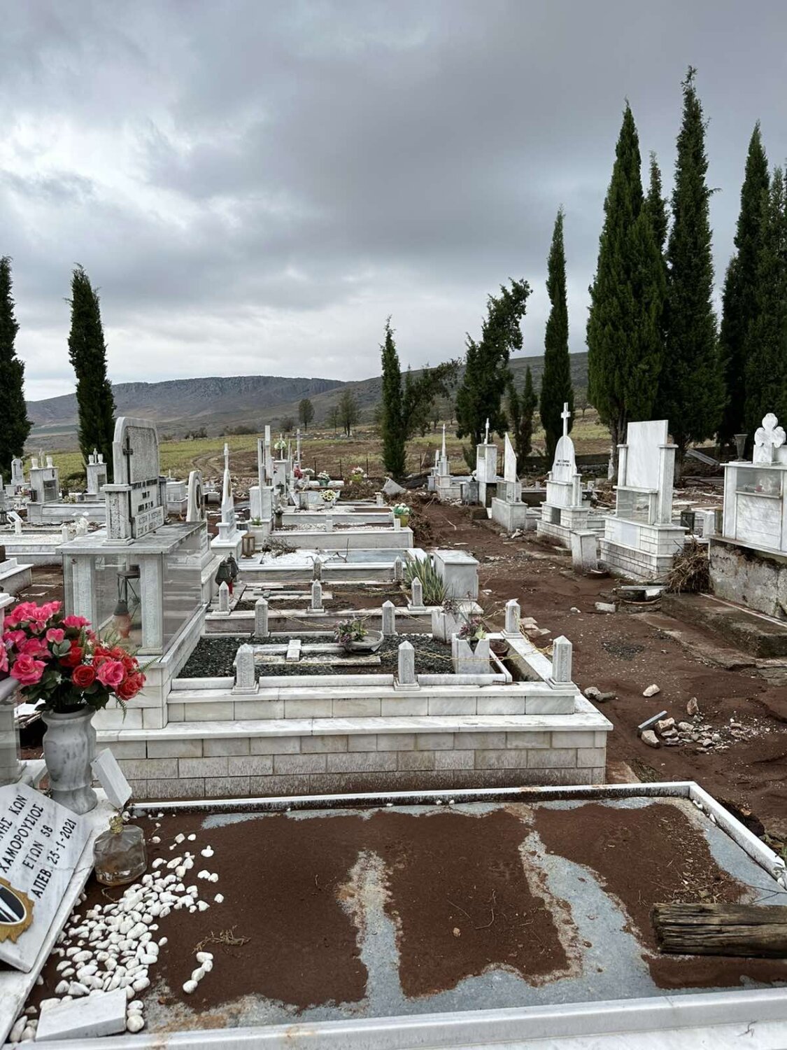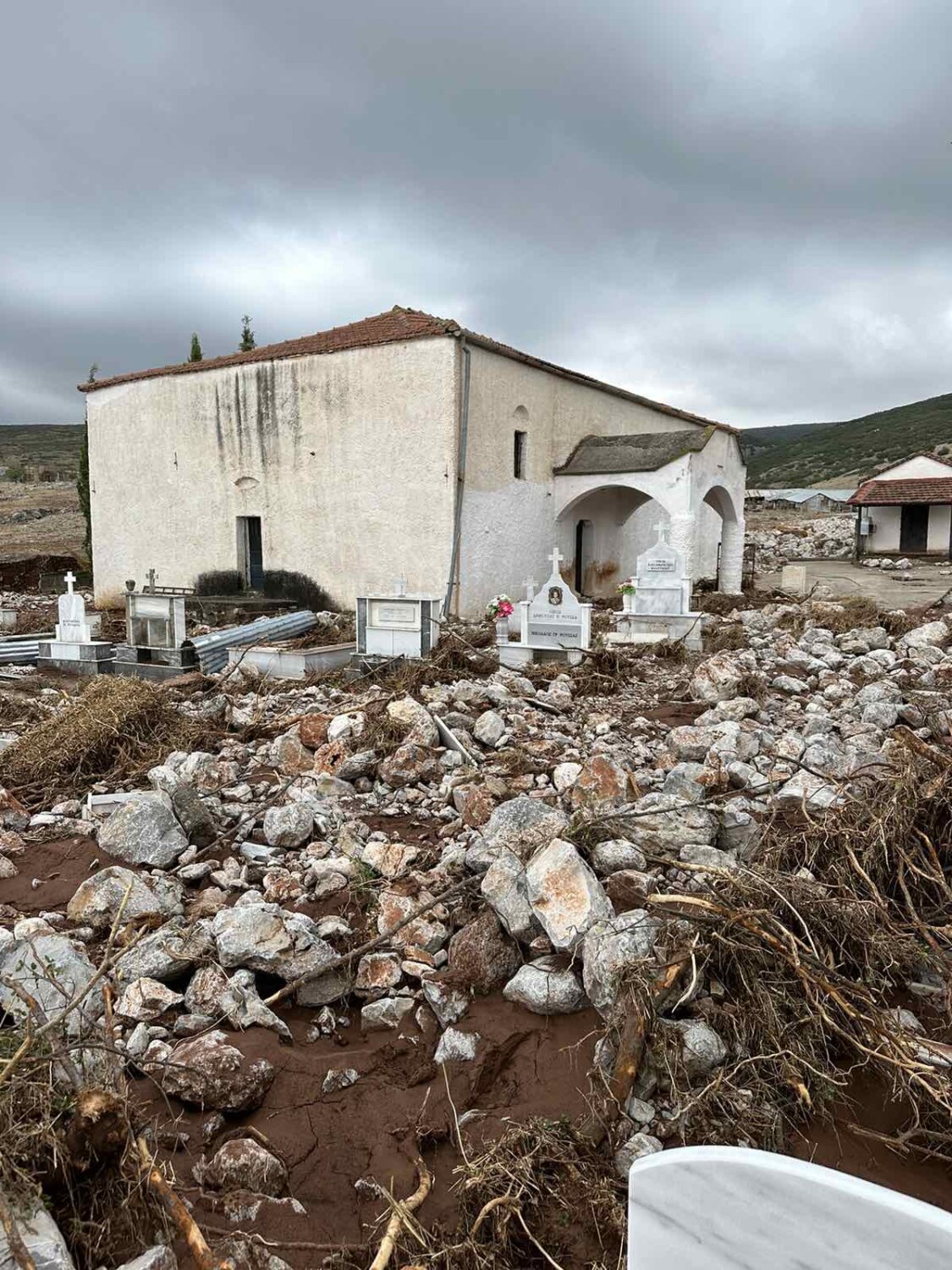 Έχουν μαζευτεί σωροί από κλαδιά, πέτρες και φερτά υλικά ανάμεσα στους τάφους και έχουν προκληθεί σημαντικές ζημιές στο κοιμητήριο.