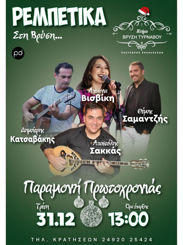 Με ρεμπέτικη κομπανία που θα σας ταξιδέψει σε κλασικά και αγαπημένα μονοπάτια θα ξεκινήσει η παραμονή της Πρωτοχρονιάς το μεσημέρι. Στο μουσικό σχήμα συμμετέχουν: