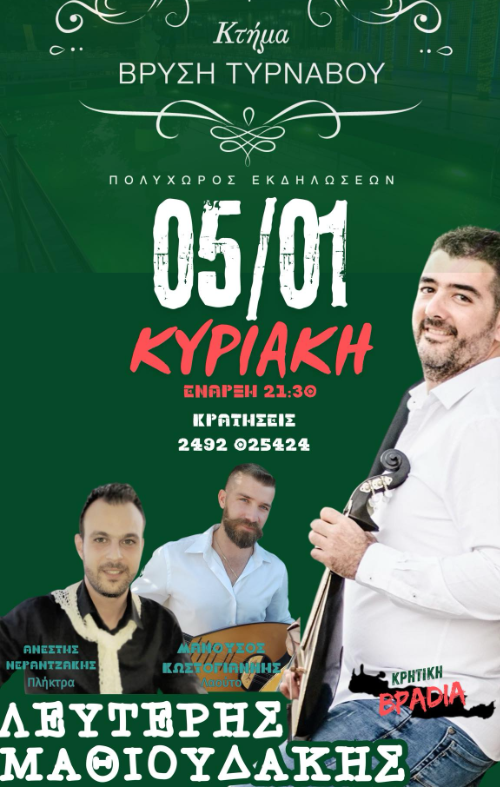 Το Κτήμα Βρύση – Πολυχώρος Εκδηλώσεων, με την εξαιρετική φήμη για την ποιότητα των εκδηλώσεών του, σας προσκαλεί να ζήσετε αξέχαστες στιγμές, γεμάτες μουσική, γεύσεις και διασκέδαση!