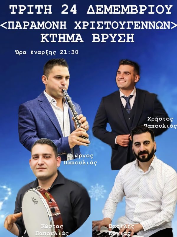 Οι γιορτές κορυφώνονται με μια ανεπανάληπτη Κρητική βραδιά, γεμάτη κέφι και παραδοσιακή μουσική από τη λεβεντογέννα Κρήτη. Μαζί σας θα είναι: