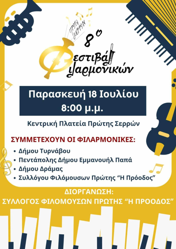Στην Πρώτη Σερρών θα βρεθούν μέλη της Φιλαρμονικής Δήμου Τυρνάβου, την Παρασκευή 18 Ιουλίου 2025, έπειτα από επίσημη πρόσκληση του Συλλόγου Φιλόμουσων Πρώτης “Η Πρόοδος” για να συμμετάσχουν στο 8ο Φεστιβάλ Φιλαρμονικών.