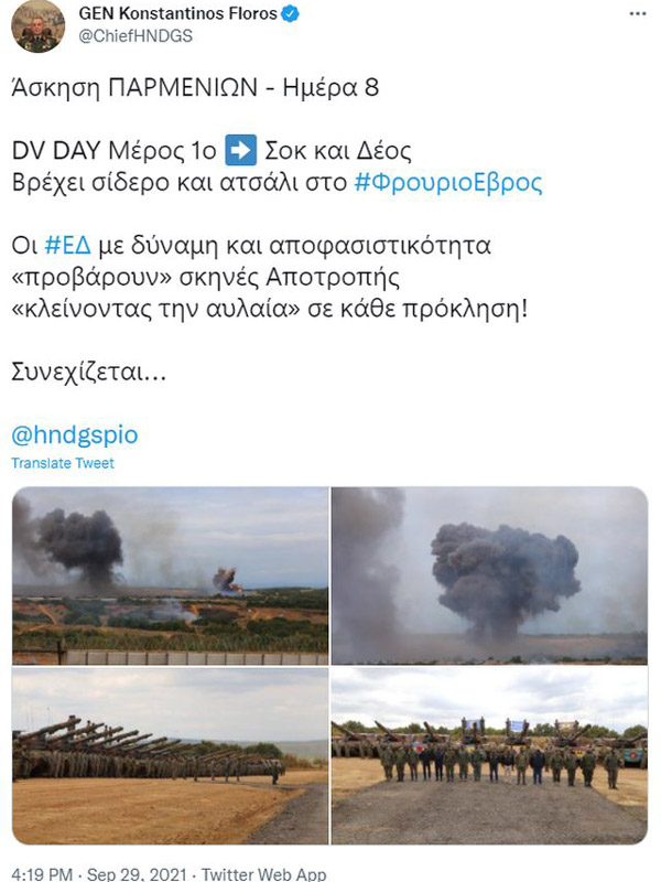 Oι Ένοπλες Δυνάμεις με δύναμη και αποφασιστικότητα «προβάρουν» σκηνές αποτροπής «κλείνοντας την αυλαία» σε κάθε πρόκληση», τονίζει σε ανάρτησή του στο Twitter ο αρχηγός του Γενικού Επιτελείου Εθνικής Άμυνας (ΓΕΕΘΑ), στρατηγός Κωνσταντίνος Φλώρος, κατά τη σημερινή Ημέρα Διακεκριμένων Επισκεπτών της άσκησης «Παρμενίων».