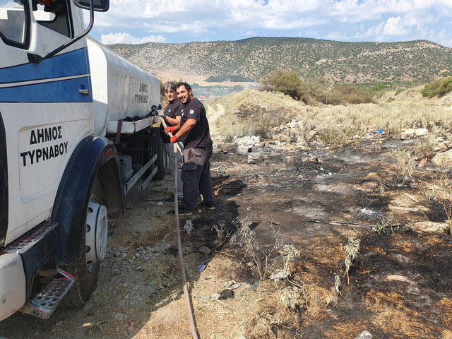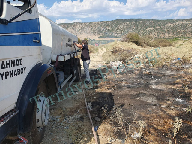 Στο σημείο βρέθηκε η πυροσβεστική με δύο οχήματα, η πολιτική προστασία με την Υδροφόρα του Δήμου Τυρνάβου και ο Αντιδήμαρχος Περιβάλλοντος Κώστας Χρυσοβέργης.