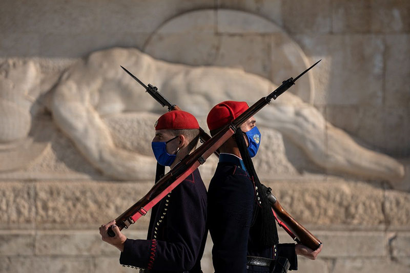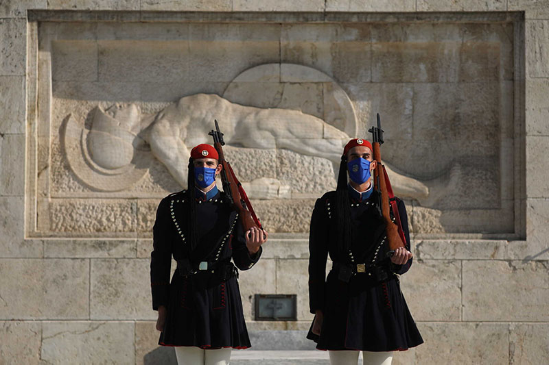 Η λεπτομέρεια αυτή είναι ότι και οι εύζωνες δεν έχουν μείνει ανεπηρέαστοι από τον κορονοϊό. Και οι εύζωνες φορούν μάσκα για να προστατευθούν από την πανδημία.