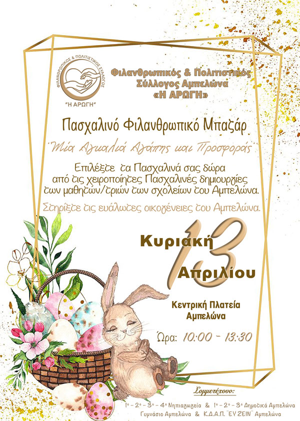 Ο Φιλανθρωπικός και Πολιτιστικός Σύλλογος «Η ΑΡΩΓΗ» στα πλαίσια των δράσεων Αλληλεγγύης, διοργανώνει την Κυριακή των Βαΐων 13 Απριλίου 2025 και ώρα 10:00 – 13:30 στην κεντρική πλατεία του Αμπελώνα το 2ο Πασχαλινό Φιλανθρωπικό Bazar ¨Μία Αγκαλιά Αγάπης και Προσφοράς¨ σε συνεργασία με 1ο – 2ο – 3ο – 4ο Νηπιαγωγεία Αμπελώνα, 1ο – 2ο – 3ο Δημοτικά Σχολεία , το Γυμνάσιο Αμπελώνα και το ΚΔΑΠ «ΕΥ ΖΕΙΝ».