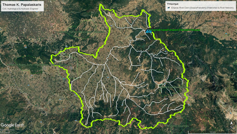 Το υδρογραφικό δίκτυο του «”Ποταμού Ενιπέα”, έως την προβλεπόμενη θέση κατασκευής του «Φράγμα Ποταμού Ενιπέα (“Σκοπιάς”) (στην θέση “Παλιοδερλί”)», “Δήμου Φαρσάλων”, “Νομού Λάρισας”», στο σημείο που βγαίνει από την συγκεκριμένη υποδιαίρεση της συνολικής υδρολογικής λεκάνης του, είναι, στο σύνολό του, ένα ρέμα «5ης Τάξης», (κατά την μέθοδο “Strahler” κατάταξης των ρεμάτων), με συνολικό μήκος ρεμάτων «1ης Τάξης», «L1STR=147.309 μ.μ.» («53 ρέματα») («ως επί το πλείστον, ορεινά πηγαία ρέματα, απομακρυσμένα από την θάλασσα»), με συνολικό μήκος ρεμάτων «2ης Τάξης», «L2STR=54.899,30 μ.μ.», («24 ρέματα») («ως επί το πλείστον, ορεινά και ημιορεινά ρέματα, απομακρυσμένα από την θάλασσα»), με συνολικό μήκος ρεμάτων «3ης Τάξης», «L3STR=34.514,20 μ.μ.» («16 ρέματα») («ως επί το πλείστον, ημιορεινά ρέματα, απομακρυσμένα από την θάλασσα»), με συνολικό μήκος ρεμάτων «4ης Τάξης», «L4STR=14.115,80 μ.μ.» («7 ρέματα») («ως επί το πλείστον, ημιπεδινά ρέματα, απομακρυσμένα από την θάλασσα») και με συνολικό μήκος ρεμάτων «5ης Τάξης», «L5STR=7.225,70 μ.μ.» («6 ρέματα») («ως επί το πλείστον, πεδινά ρέματα, απομακρυσμένα από την θάλασσα») δηλαδή με συνολικό μήκος ρεμάτων, («Ανεξάρτητα Τάξης»), ίσο με «LTOTAL=258.064,00 μ.μ.» (ή αλλιώς «L(1+2+3+4+5)TOTAL=258,064 χιλιόμετρα») («106 ρέματα»). Το συνολικό εμβαδόν της «λεκάνης απορροής» του «”Ποταμού Ενιπέα ”, έως την θέση στην οποία πρόκειται να κατασκευαστεί το «Φράγμα Ποταμού Ενιπέα (“Σκοπιάς”) (στην θέση “Παλιοδερλί”)», “Δήμου Φαρσάλων”, “Νομού Λάρισας”» είναι ίσο με «414.954,99 στρέμματα» [(«414,95 τετραγωνικά χιλιόμετρα» (km2)] (ενώ, ειδικότερα: 1).το «13,27%» («55,05 km2») του εμβαδού της επιφάνειας της λεκάνης απορροής του βρίσκεται εντός των ορίων του «Δήμου Φαρσάλων», του «Νομού Λάρισας», 2).το «59,92%» («248,65 km2») του εμβαδού της επιφάνειας της λεκάνης απορροής του βρίσκεται εντός των ορίων του «Δήμου Δομοκού», του «Νομού («Π.Ε.») Φθιώτιδας», 3).το «22,64%» («93,94 km2») του εμβαδού της επιφάνειας της λεκάνης απορροής του βρίσκεται εντός των ορίων του «Δήμου Αλμυρού», του «Νομού Μαγνησίας», 4).το «3,68%» («15,29 km2») του εμβαδού της επιφάνειας της λεκάνης απορροής του βρίσκεται εντός των ορίων του «Δήμου Λαμιέων», του «Νομού («Π.Ε.») Φθιώτιδας» και 5).το «0,49%» («2,02 km2») του εμβαδού της επιφάνειας της λεκάνης απορροής του βρίσκεται εντός των ορίων του «Δήμου Στυλίδος», του «Νομού («Π.Ε.») Φθιώτιδας» (1,2,4).