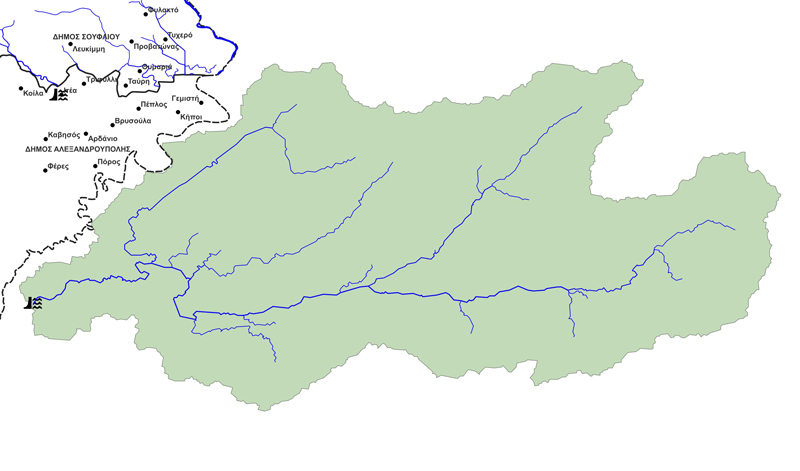 Εικόνα 1. Η απεικόνιση, της «λεκάνης απορροής» (χρωματισμένη με «ανοιχτή πράσινη» απόχρωση) (των ρεμάτων που αντιστοιχούν έως την θέση στην οποία κατασκευάστηκε, το συγκεκριμένο φράγμα), του «υδρογραφικού (γραμμικού) δικτύου» (γραμμές με «έντονη μπλε» απόχρωση), της θέσης του φράγματος (σύμβολο «φράγμα με νερό εκατέρωθεν των πλευρών του» με «μαύρη» απόχρωση) και του μετεωρολογικού σταθμού της «Βυρσίνης, Δήμου Αρριανών, Π.Ε. Ροδόπης», (σύμβολο «σύννεφο με βροχή» με «γαλάζια» απόχρωση, τα όρια των διάφορων «Δήμων» της «Π.Ε. Έβρου» (συνεχείς και διακεκομμένες γραμμές με «μαύρη» απόχρωση), οι οικισμοί της «Π.Ε. Έβρου» (κουκίδες με «μαύρη» απόχρωση), όπως απεικονίζονται στο «ελεύθερο διαδικτυακά λογισμικό» «Q.G.I.S.» [4], μέσω των σχετικών αρχείων που ανακτήθηκαν τόσο από την σχετική διαδικτυακή «πλατφόρμα» («Copernicus») όσο και από την σχετική διαδικτυακή «πλατφόρμα» («ΕΛ.ΣΤΑΤ.»), [1,2,4].