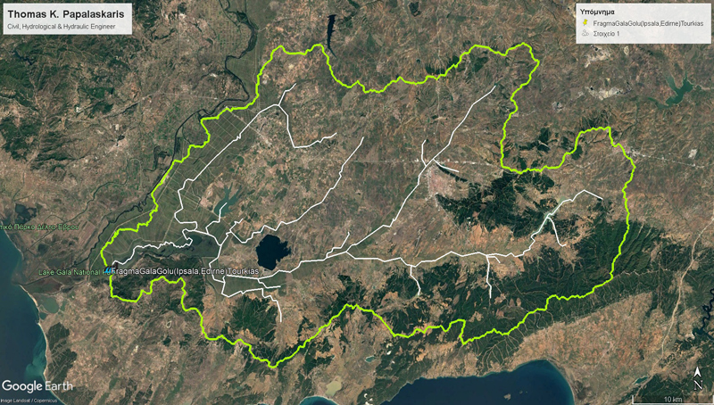 Εικόνα 3. Η απεικόνιση της λεκάνης απορροής, [εξωτερικό περίγραμμα με «ανοιχτή πράσινη» απόχρωση, που αντιστοιχεί έως την θέση όπου κατασκευάστηκε, το «Φράγμα Λίμνης “Gala Gölü” Τουρκίας»] και του (πλήρως ανεπτυγμένου) αντίστοιχου, περιεχόμενου σε αυτήν, υδρογραφικού δικτύου (γραμμές με «άσπρη» απόχρωση), της προαναφερθείσας λεκάνης απορροής επί του υπόβαθρου της διαδικτυακής πλατφόρμας «Google Earth» [1,2,4,10].