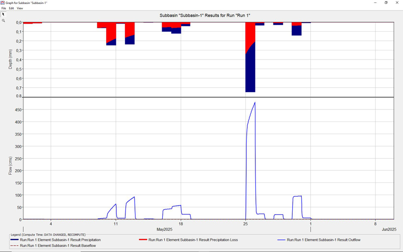 Εικόνα 2. Το «διάγραμμα / ιστόγραμμα βροχόπτωσης / απορροής» του χρονικού διαστήματος, “01-31/05/2025” (“87,20 mm”), (το οποίο και «απέδωσε» την παροχή αιχμής νερού και συγκεκριμένα «478,40 κυβικά μέτρα ανά δευτερόλεπτο» ή αλλιώς «478,40 m3/sec»), (λόγω της συνολικής, αθροιστικής, βροχόπτωσης του μήνα «Μάη 2025», [1,2,4,5,7.1-7.2].