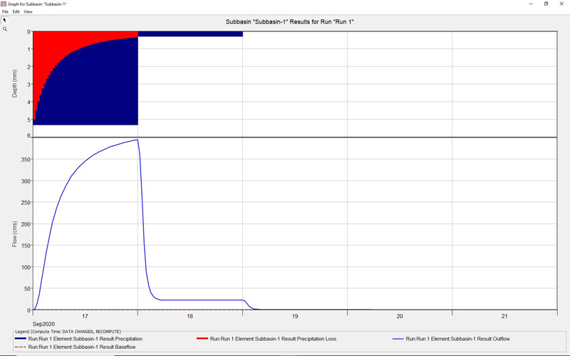 Επιπλέον, αρχικά, στην παρακάτω εικόνα απεικονίζεται το, “προσομοιωμένο ρεαλιστικό”, «ιστόγραμμα βροχόπτωσης» του χρονικού διαστήματος, “17/09-20/09/2020” (“274,80 mm”), (το οποίο και «απέδωσε» την, “προσομοιωμένη ρεαλιστική”, παροχή αιχμής νερού και συγκεκριμένα «395,00 κυβικά μέτρα ανά δευτερόλεπτο» ή αλλιώς «395,00 m3/sec»), [το οποίο και «απέδωσε», λόγω του ακραίου μετεωρολογικού φαινομένου με την κωδική ονομασία «Ιανός», την, “προσομοιωμένη ρεαλιστική”, συνολική ποσότητα νερού, συγκεκριμένα, «29.456.000 κυβικά μέτρα (τόννους νερού)» ή αλλιώς «29.456.000 m3 (τόννους νερού)»], και το αντίστοιχο, “προσομοιωμένο ρεαλιστικό”, «υδρογράφημα πλημμύρας» που προκύπτει από το συγκεκριμένο, “προσομοιωμένο ρεαλιστικό”, επεισόδιο βροχόπτωσης, (λόγω του ακραίου μετεωρολογικού φαινομένου με την κωδική ονομασία «Ιανός»), (η ανάλυση και οι υπολογισμοί έγιναν με το ελεύθερο στο διαδίκτυο λογισμικό «HEC-HMS» του «U.S.A. Army Corps of Engineers» δηλαδή του «Σώματος Μηχανικών του Στρατού των Η.Π.Α.») [1,2,4,5,6.1,6.2,7].