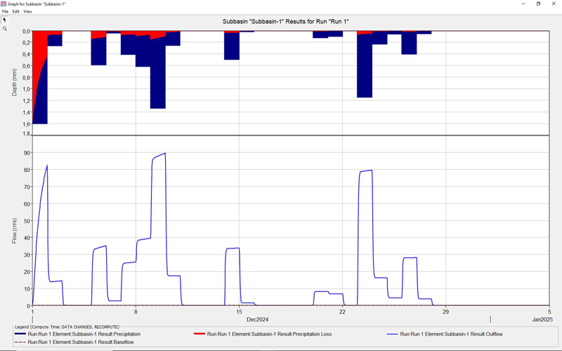 Επιπλέον, αρχικά, στην παρακάτω εικόνα απεικονίζεται το, “προσομοιωμένο ρεαλιστικό”, «διάγραμμα/ιστόγραμμα βροχόπτωσης/απορροής» του χρονικού διαστήματος, “01-31/12/2024” (“373,00 mm”), (το οποίο και «απέδωσε» την, “προσομοιωμένη ρεαλιστική”, ενδεικτική, παροχή αιχμής, ομαλής παροχέτευσης, νερού και συγκεκριμένα «89,60 κυβικά μέτρα ανά δευτερόλεπτο» ή αλλιώς «89,60 m3/sec»), [το οποίο και «απέδωσε», λόγω των τελευταίων πρόσφατων βροχοπτώσεων, την, “προσομοιωμένη ρεαλιστική”, συνολική ποσότητα νερού, συγκεκριμένα, «39.504.300 κυβικά μέτρα (τόννους νερού)» ή αλλιώς «39.504.300 m3 (τόννους νερού)»], και το αντίστοιχο, “προσομοιωμένο ρεαλιστικό”, «υδρογράφημα πλημμύρας» που προκύπτει από τα συγκεκριμένα, “προσομοιωμένα ρεαλιστικά”, επεισόδια βροχοπτώσεων, (λόγω των πρόσφατων βροχοπτώσεων), (η ανάλυση και οι υπολογισμοί έγιναν με το ελεύθερο στο διαδίκτυο λογισμικό «HEC-HMS» του «U.S.A. Army Corps of Engineers» δηλαδή του «Σώματος Μηχανικών του Στρατού των Η.Π.Α.») [1,2,4,5,6.1-6.4,7].