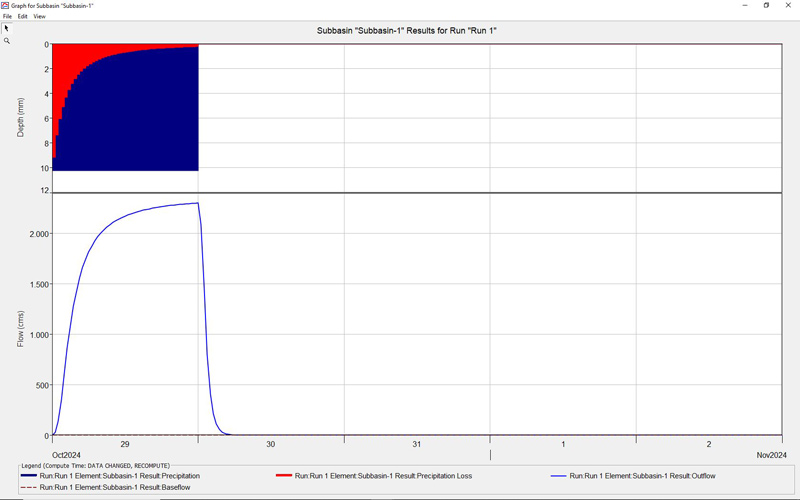 Επιπλέον, αρχικά, στην παρακάτω εικόνα απεικονίζεται το, “προσομοιωμένο ρεαλιστικό”, «ιστόγραμμα βροχόπτωσης» του χρονικού διαστήματος, “29/10/2024” (“491,20 mm”), (το οποίο και «απέδωσε» την, “προσομοιωμένη ρεαλιστική”, παροχή αιχμής νερού και συγκεκριμένα «2.302,50 κυβικά μέτρα ανά δευτερόλεπτο» ή αλλιώς «2.302,50 m3/sec»), [το οποίο και «απέδωσε», λόγω του ακραίου μετεωρολογικού φαινομένου με την κωδική ονομασία «Dana», την, “προσομοιωμένη ρεαλιστική”, συνολική ποσότητα νερού, συγκεκριμένα, «173.856.300 κυβικά μέτρα (τόννους νερού)» ή αλλιώς «173.856.300 m3 (τόννους νερού)»], και το αντίστοιχο, “προσομοιωμένο ρεαλιστικό”, «υδρογράφημα πλημμύρας» που προκύπτει από το συγκεκριμένο, “προσομοιωμένο ρεαλιστικό”, επεισόδιο βροχόπτωσης, (λόγω του ακραίου μετεωρολογικού φαινομένου με την κωδική ονομασία «Dana», που συνέβη στην ευρύτερη περιοχή της «Σίβα, Βαλένθια, Ισπανία»), (η ανάλυση και οι υπολογισμοί έγιναν με το ελεύθερο στο διαδίκτυο λογισμικό «HEC-HMS» του «U.S.A. Army Corps of Engineers» δηλαδή του «Σώματος Μηχανικών του Στρατού των Η.Π.Α.») [1,2,4,5,6.1,6.2,7,12.1-12.2].