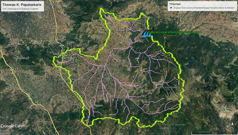 Εικόνα 3. Η απεικόνιση της λεκάνης απορροής, [επιφάνεια με «ανοιχτή πράσινη» απόχρωση, που αντιστοιχεί έως την θέση όπου πρόκειται να κατασκευαστεί το «Φράγμα Ποταμού Ενιπέα (“Σκοπιάς”) (στην θέση “Παλιοδερλί”)», (“Δήμου Φαρσάλων”) (όπου η συγκεκριμένη θέση απεικονίζεται με την χρήση σχετικού απεικονιστικού συμβόλου), Νομού Λάρισας”»] και του (πλήρως ανεπτυγμένου) αντίστοιχου, περιεχόμενου σε αυτήν, υδρογραφικού δικτύου (γραμμές με «ανοιχτή ροζ» απόχρωση), του «Ποταμού Ενιπέα» επί του υπόβαθρου της διαδικτυακής πλατφόρμας «Google Earth» [1,2,4,10].