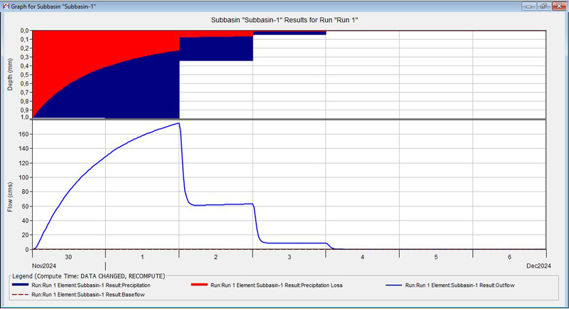 Επιπλέον, αρχικά, στην παρακάτω εικόνα απεικονίζεται το, “προσομοιωμένο ρεαλιστικό”, «ιστόγραμμα βροχόπτωσης» του χρονικού διαστήματος, “30/11-03/12/2024” (“110,80 mm”), (το οποίο και «απέδωσε» την, “προσομοιωμένη ρεαλιστική”, παροχή αιχμής νερού και συγκεκριμένα «175,20 κυβικά μέτρα ανά δευτερόλεπτο» ή αλλιώς «175,20 m3/sec»), [το οποίο και «απέδωσε», λόγω της πρόσφατης βροχόπτωσης, (και συγκεκριμένα το ακραίο μετεωρολογικό φαινόμενο με την αντιστοιχισμένη ονομασία «Bora»), την, “προσομοιωμένη ρεαλιστική”, συνολική ποσότητα νερού, συγκεκριμένα, «26.737.500 κυβικά μέτρα (τόννους) νερού» ή αλλιώς «26.737.500 m3 (τόννους) νερού»], και το αντίστοιχο, “προσομοιωμένο ρεαλιστικό”, «υδρογράφημα πλημμύρας» που προκύπτει από το συγκεκριμένο, “προσομοιωμένο ρεαλιστικό”, επεισόδιο βροχόπτωσης, (λόγω της πρόσφατης βροχόπτωσης), (και συγκεκριμένα το ακραίο μετεωρολογικό φαινόμενο με την αντιστοιχισμένη ονομασία «Bora»), (η ανάλυση και οι υπολογισμοί έγιναν με το ελεύθερο στο διαδίκτυο λογισμικό «HEC-HMS» του «U.S.A. Army Corps of Engineers» δηλαδή του «Σώματος Μηχανικών του Στρατού των Η.Π.Α.») [1,2,4,5,6.1,6.2,7].