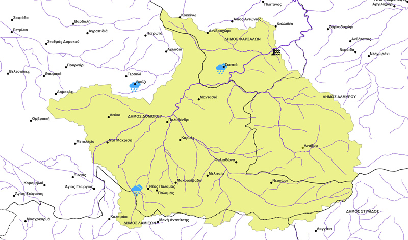 Εικόνα 1. Η απεικόνιση, της «λεκάνης απορροής» (επιφάνεια με «ανοιχτή πράσινη» απόχρωση) (του «”Ενιπέα Ποταμού” που αντιστοιχεί έως την θέση στην οποία πρόκειται να κατασκευαστεί το «Φράγμα Ποταμού Ενιπέα (“Σκοπιάς”) (στην θέση “Παλιοδερλί”)», η οποία βρίσκεται στην κατάντη πλευρά του οικισμού «Σκοπιά» του «Δήμου Φαρσάλων»), του «υδρογραφικού (γραμμικού) δικτύου» (γραμμές με «έντονη μπλε» απόχρωση με διαβάθμιση του πάχους της γραμμής, όπου το πάχος της κάθε γραμμής εξαρτάται από την “τάξη” του εκάστοτε ρέματος που αντιπροσωπεύει δηλαδή όσο μεγαλύτερη είναι η “τάξη” του ρέματος τόσο παχύτερη είναι και η αντίστοιχη γραμμή που το αντιπροσωπεύει), των «οικισμών του Δήμου Φαρσάλων», των «οικισμών του Δήμου Δομοκού», των «οικισμών του Δήμου Αλμυρού». των «οικισμών του Δήμου Λαμιέων», και των «οικισμών του Δήμου Στυλίδος» (κουκίδες με «μαύρη» απόχρωση και ονομασία, επίσης, με «μαύρη» απόχρωση), του «περιγράμματος του “Δήμου Φαρσάλων”», του «περιγράμματος του “Δήμου Δομοκού”», του «περιγράμματος του “Δήμου Αλμυρού”», του «περιγράμματος του “Δήμου Λαμιέων”», του «περιγράμματος του “Δήμου Στυλίδος”» (γραμμές με «μαύρη» απόχρωση), της θέσης του φράγματος (θεματικό εικονίδιο «φράγμα με νερό στην μία πλευρά του» με «μαύρη» απόχρωση) και των μετεωρολογικών σταθμών «Βουζίου, Δομοκού, Φθιώτιδας», «Σκοπιάς, Φαρσάλων, Λάρισας» και «Νέου Παλαμά, Δομοκού, Φθιώτιδας» (θεματικό εικονίδιο «σύννεφο με βροχή» με «γαλάζια» απόχρωση), όπως απεικονίζονται στο «ελεύθερο διαδικτυακά λογισμικό» «Q.G.I.S.» [4], μέσω των σχετικών αρχείων που ανακτήθηκαν τόσο από την σχετική διαδικτυακή «πλατφόρμα» («Copernicus») όσο και από την σχετική διαδικτυακή «πλατφόρμα» («ΕΛ.ΣΤΑΤ.»),[1,2,4].