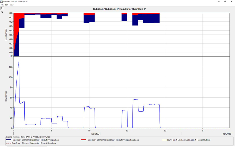 Επιπλέον, αρχικά, στην παρακάτω εικόνα απεικονίζεται το, “προσομοιωμένο ρεαλιστικό”, «διάγραμμα / ιστόγραμμα βροχόπτωσης / απορροής» του χρονικού διαστήματος, “01-31/12/2024” (“177,20 mm”), (το οποίο και «απέδωσε» την, “προσομοιωμένη ρεαλιστική”, ενδεικτική, παροχή αιχμής, ομαλής παροχέτευσης, νερού και συγκεκριμένα «130,10 κυβικά μέτρα ανά δευτερόλεπτο» ή αλλιώς «130,10 m3/sec»), [το οποίο και «απέδωσε», λόγω της, συγκεκριμένης αλληλουχίας, βροχόπτωσης, την, “προσομοιωμένη ρεαλιστική”, συνολική ποσότητα νερού, συγκεκριμένα, «49.755.700 κυβικά μέτρα (τόννους νερού)» ή αλλιώς «49.755.700 m3 (τόννους νερού)»], και το αντίστοιχο, “προσομοιωμένο ρεαλιστικό”, «υδρογράφημα πλημμύρας» που προκύπτει από το συγκεκριμένο, “προσομοιωμένο ρεαλιστικό”, επεισόδιο, συγκεκριμένης αλληλουχίας βροχόπτωσης, (η ανάλυση και οι υπολογισμοί έγιναν με το ελεύθερο στο διαδίκτυο λογισμικό «HEC-HMS» του «U.S.A. Army Corps of Engineers» δηλαδή του «Σώματος Μηχανικών του Στρατού των Η.Π.Α.») [1,2,4,5,6.1-6.4,7.1-7.2].