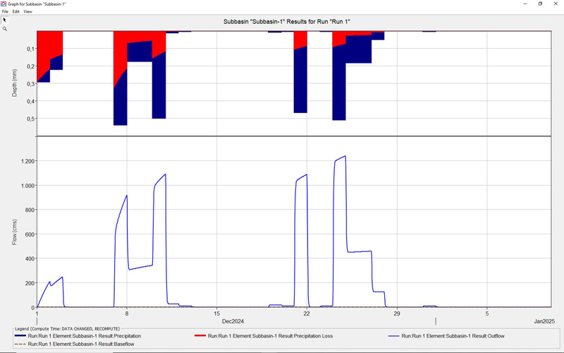 Εικόνα 2. Το «διάγραμμα / ιστόγραμμα βροχόπτωσης / απορροής» του χρονικού διαστήματος, “01-31/12/2024” (“159,80 mm”), (το οποίο και «απέδωσε» την παροχή αιχμής νερού και συγκεκριμένα «1.240,60 κυβικά μέτρα ανά δευτερόλεπτο» ή αλλιώς «1.240,60 m3/sec»), (λόγω της συνολικής, αθροιστικής, βροχόπτωσης του μήνα «Δεκέμβρη 2024», [1,2,4,5,7.1-7.3].