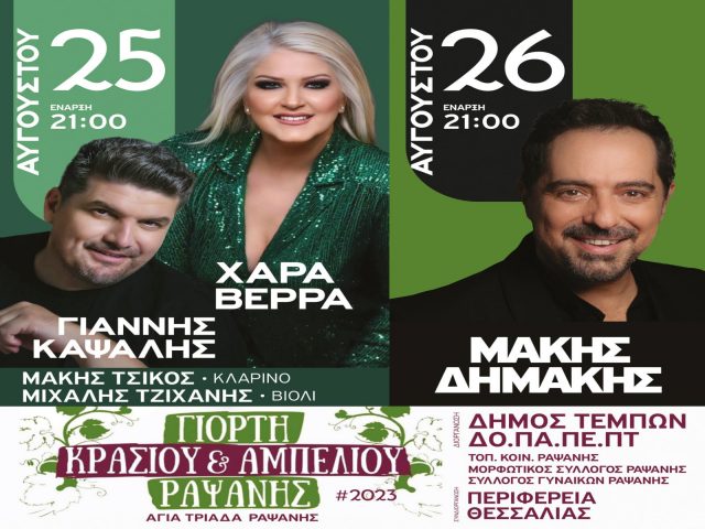 Οι εκδηλώσεις είναι διήμερες και ξεκινούν την Παρασκευή 25 Αυγούστου στις 21:00 μ.μ. με τη συναυλία του Γιάννη Καψάλη και της Χαράς Βέρρα στην Αγία Τριάδα Ραψάνης.