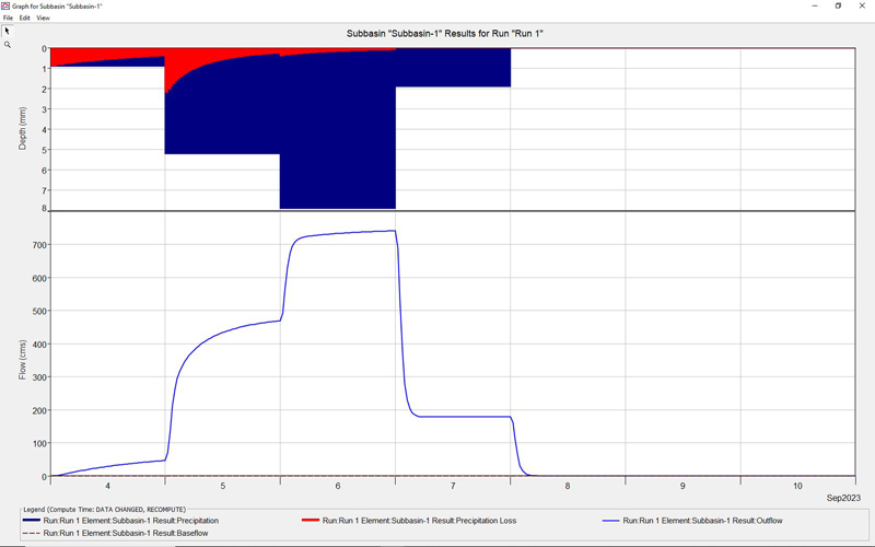 Επιπλέον, αρχικά, στην παρακάτω εικόνα απεικονίζεται το, “προσομοιωμένο ρεαλιστικό”, «ιστόγραμμα βροχόπτωσης» του χρονικού διαστήματος, “04/09-07/09/2023” (“762,40 mm”), (το οποίο και «απέδωσε» την, “προσομοιωμένη ρεαλιστική”, παροχή αιχμής νερού και συγκεκριμένα «741,00 κυβικά μέτρα ανά δευτερόλεπτο» ή αλλιώς «741,00 m3/sec»), [το οποίο και «απέδωσε», λόγω του ακραίου μετεωρολογικού φαινομένου με την κωδική ονομασία «Daniel», την, “προσομοιωμένη ρεαλιστική”, συνολική ποσότητα νερού, συγκεκριμένα, «117.662.000 κυβικά μέτρα (τόννους νερού)» ή αλλιώς «117.662.000 m3 (τόννους νερού)»], και το αντίστοιχο, “προσομοιωμένο ρεαλιστικό”, «υδρογράφημα πλημμύρας» που προκύπτει από το συγκεκριμένο, “προσομοιωμένο ρεαλιστικό”, επεισόδιο βροχόπτωσης, (λόγω του ακραίου μετεωρολογικού φαινομένου με την κωδική ονομασία «Daniel»), (η ανάλυση και οι υπολογισμοί έγιναν με το ελεύθερο στο διαδίκτυο λογισμικό «HEC-HMS» του «U.S.A. Army Corps of Engineers» δηλαδή του «Σώματος Μηχανικών του Στρατού των Η.Π.Α.») [1,2,4,5,6.1,6.2,7].