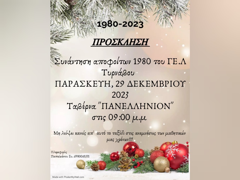 Την Παρασκευή, 29 Δεκεμβρίου 2023 και ώρα 9.00 μ.μ. στην ταβέρνα “Πανελλήνιο” στον Τύρναβο θα πραγματοποιηθεί συνάντηση (reunion) των αποφοίτων του 1980 από το Λύκειο Τυρνάβου