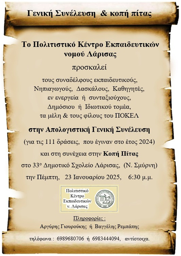 Το Πολιτιστικό Κέντρο Εκπαιδευτικών νομού Λάρισας πραγματοποιεί τη Γενική Συνέλευση για τον απολογισμό των δράσεων, του έτους 2024 και στη συνέχεια την Κοπή Πίτας, την Πέμπτη, 23 Ιανουαρίου 2025, στις 6:30 μ.μ., στο 33ο Δημοτικό Σχολείο Λάρισας, στη Νέα Σμύρνη, στην αίθουσα εκδηλώσεων.