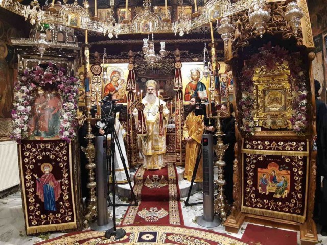 Ο Σεβασμιώτατος χοροστάτησε στον Όρθρο και προεξήρχε της Δισαρχιερατικής Θείας Λειτουργίας. Στο κήρυγμά του ο κ. Ιερώνυμος τόνισε πως το Άγιο Πνεύμα συγκροτεί όλον τον θεσμόν της Εκκλησίας και οδηγεί εις πάσαν την αλήθειαν, άρα την αλήθεια κανείς την βρίσκει μόνο στην Εκκλησία με τη Χάρη και τον φωτισμό του Αγίου Πνεύματος. Ευχαρίστησε δε τον Σεβασμιώτατο κ. Χαρίτωνα για την τιμητική πρόσκληση και ευχήθηκε στο εκκλησίασμα το φωτισμό του Αγίου Πνεύματος στην ζωή τους.