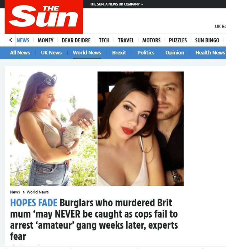Οι διαρρήκτες που δολοφόνησαν την 20χρονη Καρολάιν, μπορεί να μην συλληφθούν ποτέ. Αυτό επισημαίνει, μεταξύ άλλων, η διαδικτυακή έκδοση της βρετανικής εφημερίδας Sun, η οποία επικαλούμενη εγκληματολόγους αναφέρεται στο φρικτό έγκλημα που συγκλόνισε την Ελλάδα.
