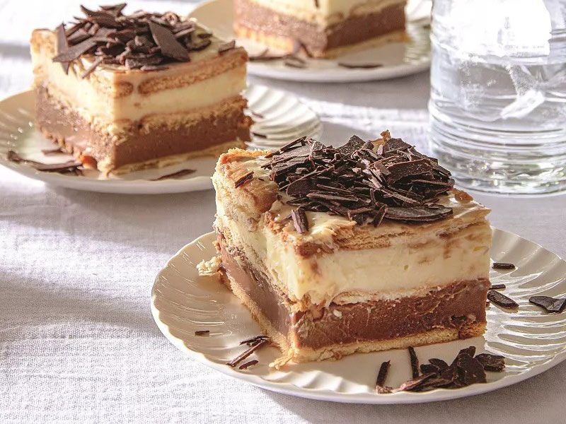 Τελειώνουμε με άλλη μία στρώση μπισκότων βουτηγμένων στο γάλα. Aφήνουμε το γλυκό να κρυώσει στο ψυγείο, γαρνίρουμε με φλοίδες σοκολάτας και πασπαλίζουμε με ζάχαρη άχνη.
