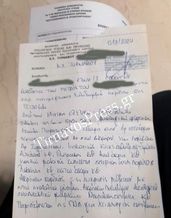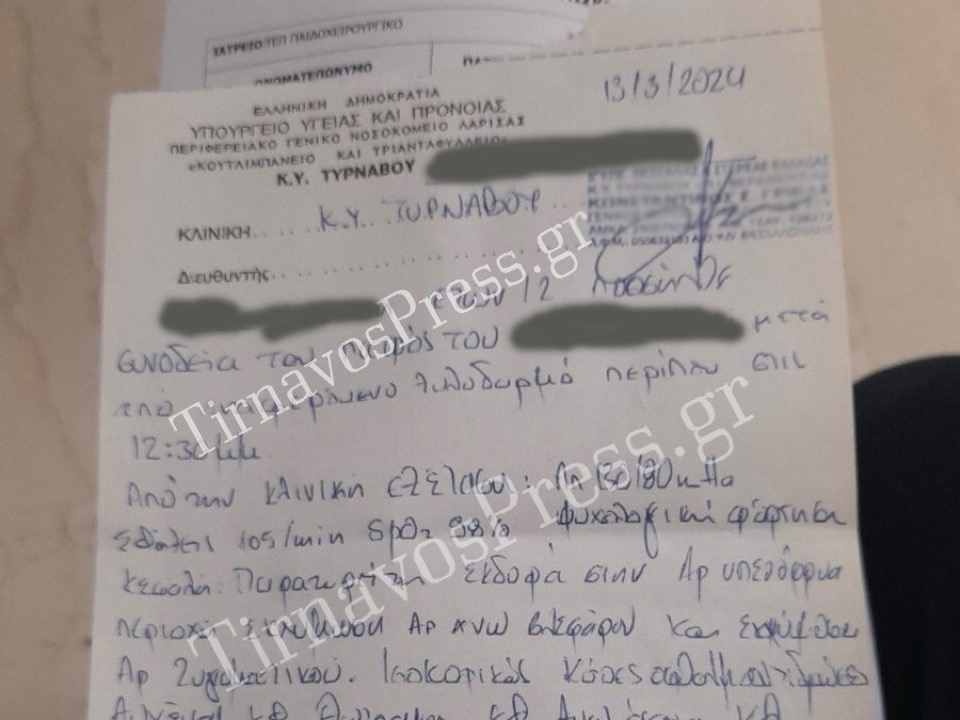 Όσον αναφορά την γνωμάτευση του Κέντρου Υγείας που δημοσιεύει αποκλειστικά το tirnavospress.gr φαίνεται πως το παιδί είχε ψυχολογική φόρτιση, σοβαρά τραύματα ενώ οι γιατροί που το εξέτασαν ζήτησαν να μεταφερθεί και στο Γενικό Νοσοκομείο Λάρισας για περαιτέρω εξετάσεις. Οι νέες πληροφορίες διαψεύδουν παράλληλα και τα δημοσιεύματα που αναφέρουν πως το παιδί είχε επισκεφθεί το κέντρο υγείας για προληπτικούς λόγους αλλά και πως το θέμα θεωρείτε λήξαν. Επίσης υπάρχουν και φωτογραφικά ντοκουμέντα που για ευνόητους λόγους δεν δημοσιεύονται.