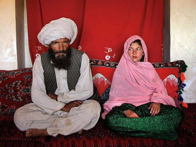 «Ένα 11χρονο κορίτσι στην Γκόουρ στο Αφγανιστάν κάθεται δίπλα στον αρραβωνιαστικό της, ο οποίος εκτιμάται ότι διανύει τη δεκαετία των 40, στην τελετή των αρραβώνων τους, λίγο πριν τον γάμο τους, το 2005», αναφέρει χαρακτηριστικά στη λεζάντα η φωτογράφος.