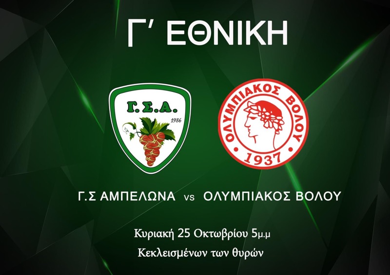 Την Κυριακή στις 5 το απόγευμα η ομάδα του Γ.Σ Αμπελώνα φιλοξενεί την ομάδα του Ολυμπιακού Βόλου σε ένα αγώνα της Γ´ Εθνικής κατηγορίας basketball. Η ομάδα επιστρέφει στην Γ’ Εθνική μετά από 10 ολόκληρα χρόνια, έτσι αν δεν παρουσιαστούν προβλήματα λόγω του κορωνοιού θα δώσει το πρώτο ματς στη κατηγορία.