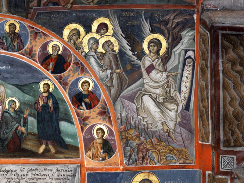 Όταν έφτασαν εκεί, είδαν διάφορες οπτασίες: τους αστράπτοντες δύο αγγέλους στο εσωτερικό του μνημείου καί εκείνον που καθόταν πάνω στον λίθο. Ύστερα είδαν και τον ίδιο τον Χριστό και Τον προσκύνησαν, καί η Μαγδαληνή Τον είδε και νομίζοντάς Τον κηπουρό Τον ρωτούσε.