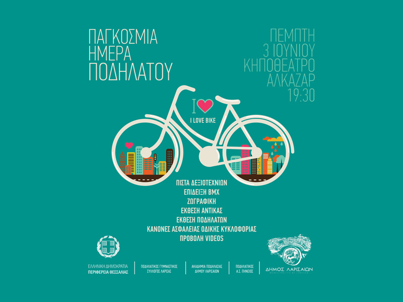 Την Παγκόσμια Ημέρα Ποδηλάτου, γιορτάζουν η Περιφέρεια Θεσσαλίας και ο Δήμος Λαρισαίων, με ανοιχτή εκδήλωση που συνδιοργανώνουν την Πέμπτη 3 Ιουνίου, από τις 7.30 μ.μ. στο Κηποθέατρο Αλκαζάρ, σε συνεργασία με τον Ποδηλατικό Γυμναστικό Σύλλογο Λάρισας, την Ακαδημία Ποδηλασίας Δήμου Λαρισαίων και τον Ποδηλατικό Α.Σ. Πηνειός.