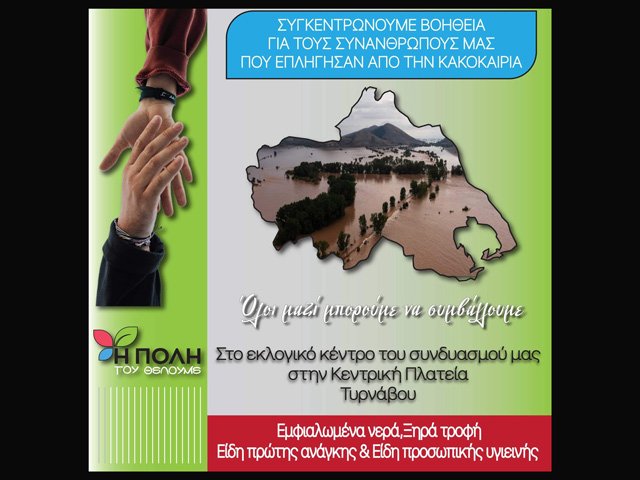 Καλούμε όλους τους δημότες να αποδείξουν έμπρακτα την κοινωνική ευαισθησία τους και το επόμενο διήμερο (μέχρι την Κυριακή το βράδυ) να βοηθήσει στη συγκέντρωση αγαθών, τα οποία θα σταλούν για την κάλυψη αναγκών κατοίκων περιοχών που επλήγησαν από την καταστροφική επέλαση του Daniel! Ενδεικτικά, συγκεντρώνουμε στο εκλογικό μας κέντρο στην πλατεία του Τυρνάβου προϊόντα, όπως νερά, χαρτικά, κονσέρβες, πάνες, σερβιέτες, χυμούς, κρεμοσάπουνα, τροφή που δεν χρειάζεται ιδιαίτερη επεξεργασία για κατανάλωση.