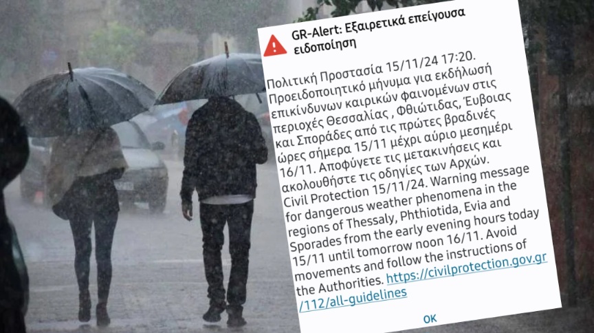 Το μήνυμα ενημερώνει για την επικείμενη κακοκαιρία “ALEXANDROS”, η οποία αναμένεται να προκαλέσει επικίνδυνα καιρικά φαινόμενα από τις πρώτες βραδινές ώρες της Παρασκευής (15/11) έως το μεσημέρι του Σαββάτου (16/11). Η Πολιτική Προστασία καλεί τους πολίτες να αποφύγουν τις μετακινήσεις και να ακολουθούν πιστά τις οδηγίες των Αρχών.