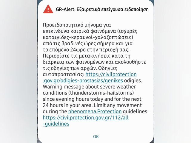 Προειδοποιητικό μήνυμα για επικίνδυνα καιρικά φαινόμενα (ισχυρές καταιγίδες-κεραυνοί-χαλαζοπτώσεις) από τις βραδινές ώρες σήμερα και για το επόμενο 24ωρο στην περιοχή σας. Περιορίστε τις μετακινήσεις κατά τη διάρκεια των φαινομένων και ακολουθήστε τις οδηγίες των αρχών. Οδηγίες αυτοπροστασίας: https://civilprotection.gov.gr/odigies-prostasias/genikes