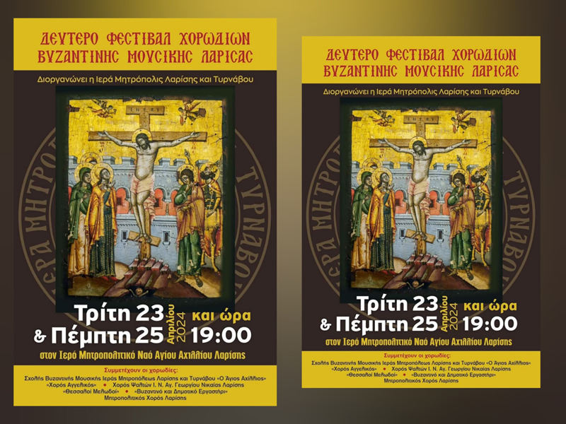 Το 2ο Φεστιβάλ χορωδιών βυζαντινής μουσικής διοργανώνεται την Τρίτη 23 Απριλίου 2024 στις 19:00’ στον ιερό ναό Αγίου Αχιλλίου Λαρίσης. Στην εν λόγω εκδήλωση θα συμμετάσχουν οι χορωδίες βυζαντινής μουσικής της Μητροπόλεως.