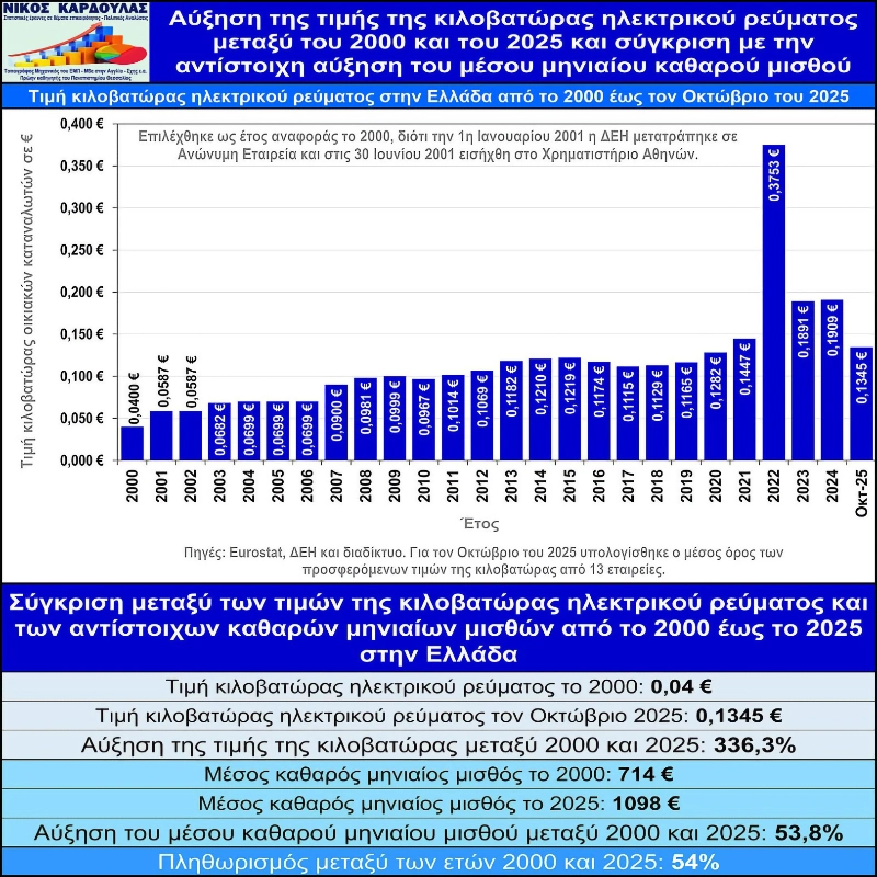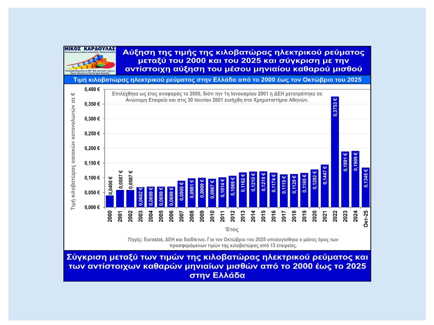 Εντυπωσιακά στοιχεία για τη ραγδαία αύξηση της τιμής του ηλεκτρικού ρεύματος σε σχέση με τους μισθούς παρουσιάζει ο Νίκος Καρδούλας. Όπως προκύπτει από την ανάλυσή του, την περίοδο 2000-2025 η τιμή της κιλοβατώρας αυξήθηκε πάνω από έξι φορές περισσότερο από τον μέσο καθαρό μισθό, ξεπερνώντας κατά πολύ τον πληθωρισμό.