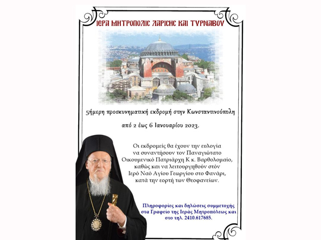 Η Ιερά Μητρόπολη Λαρίσης και Τυρνάβου διοργανώνει 5νθήμερη προσκυνηματική εκδρομή στη Βασιλίδα των Πόλεων, στην Κωνσταντινούπολη, από τις 2 έως τις 6 Ιανουαρίου, με επικεφαλής τον Σεβασμιώτατο Μητροπολίτη Λαρίσης και Τυρνάβου κ. Ιερώνυμο.