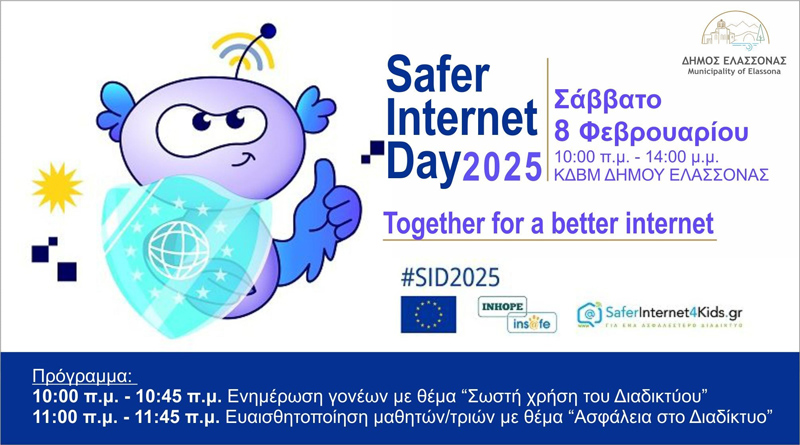 Με αφορμή την Ημέρα Ασφαλούς Διαδικτύου που γιορτάζεται κάθε Φεβρουάριο, ο Δήμος Ελασσόνας σε συνεργασία με τους εκπαιδευτικούς πληροφορικής, κ.κ. Σκυβαλίδα Νικόλαο και Καλύβα Αντώνιο, διοργανώνουν ημερίδα, αυτό το Σάββατο 8 Φεβρουαρίου στην αίθουσα του Κ.Δ.Β.Μ. του Δήμου Ελασσόνας και ώρες 10:00 π.μ. έως 12:00 μ.μ..
