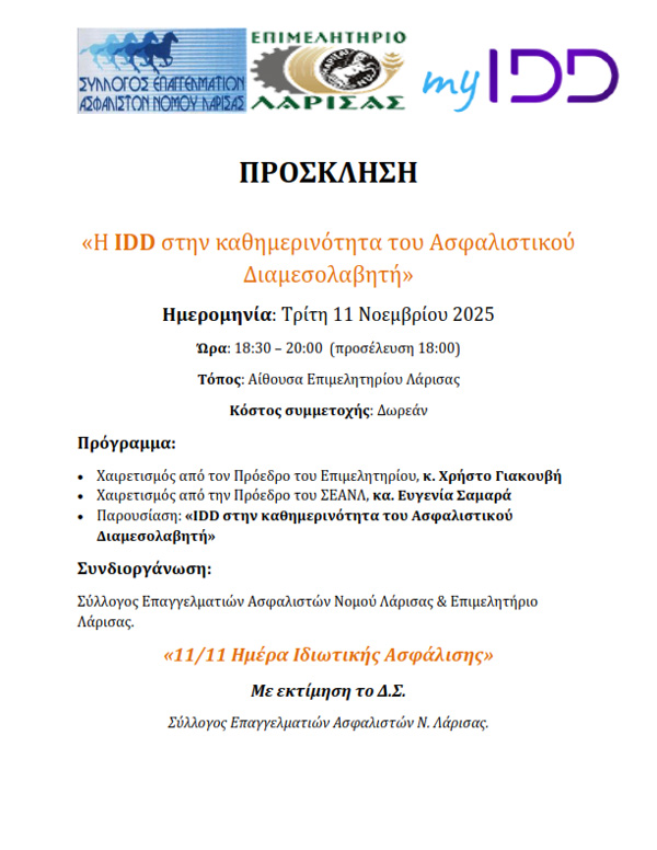 - Παρουσίαση: «IDD στην καθημερινότητα του Ασφαλιστικού Διαμεσολαβητή» από τον