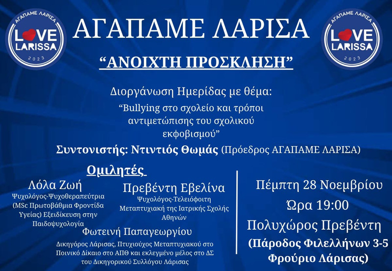Το σωματείο ΑΓΑΠΑΜΕ ΛΑΡΙΣΑ διοργανώνει ενημερωτική Ημερίδα, στην φιλόξενη αίθουσα του Πολυχώρου Τέχνης Πρεβέντη στο λόφο του Φρουρίου, με θέμα “Bullying στο σχολείο και τρόποι αντιμετώπισης του σχολικού εκφωβισμού”, την Πέμπτη 28 Νοεμβρίου 2024 στις 19:00.
